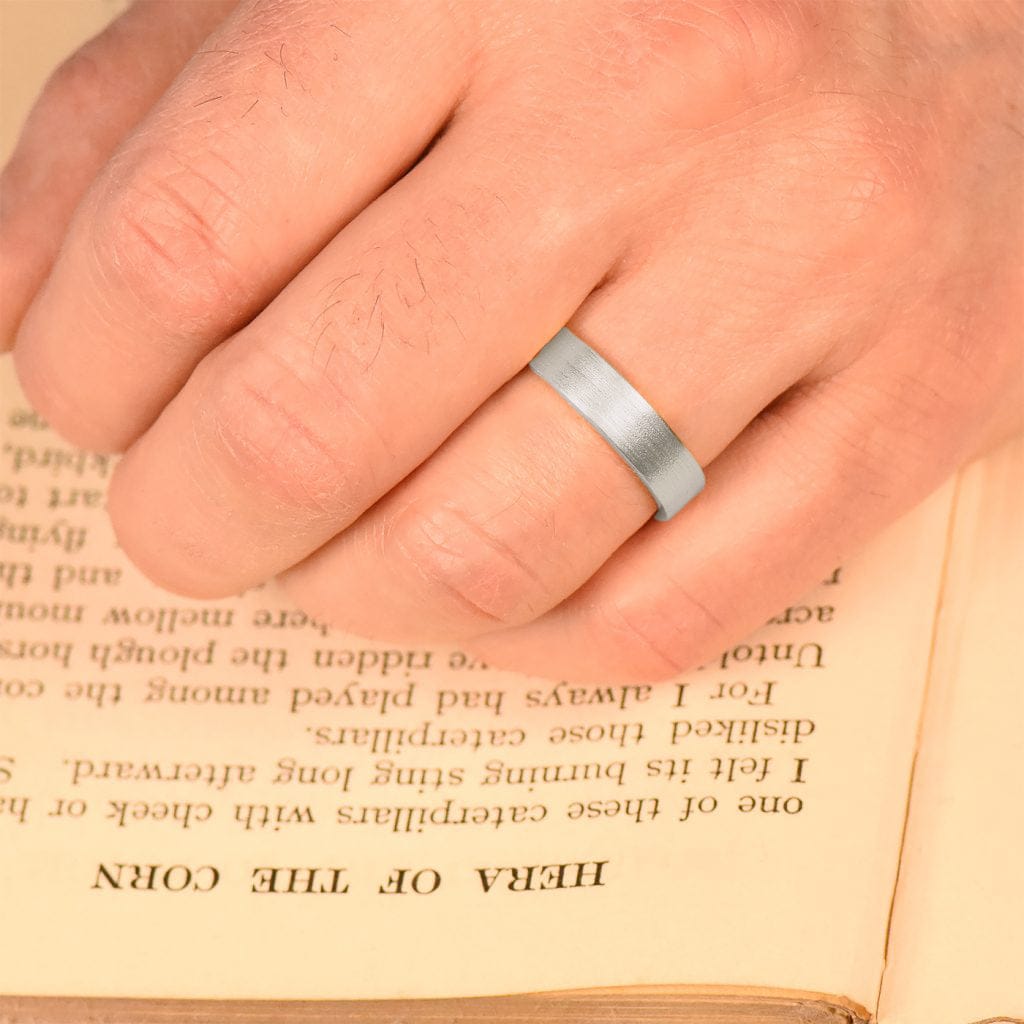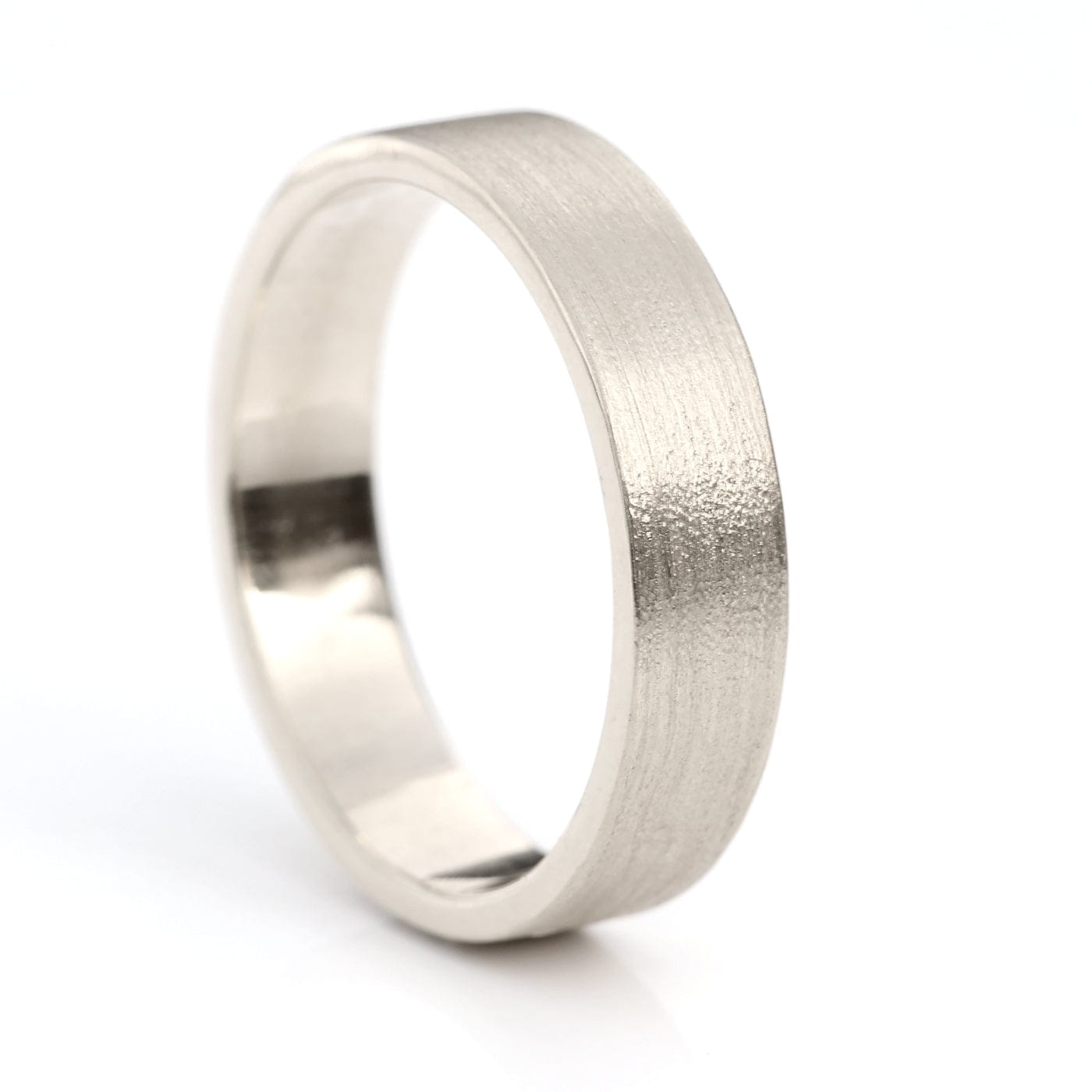 The perfect choice for fans of wide wedding bands wanting a slimmer profile. Measuring 5mm in width, this flat profile wedding ring can be detailed with a choice of 5 finishes that can be applied for no additional charge. Your wedding ring will be made to order using ethical 18ct palladium white gold obtained from recycled sources.