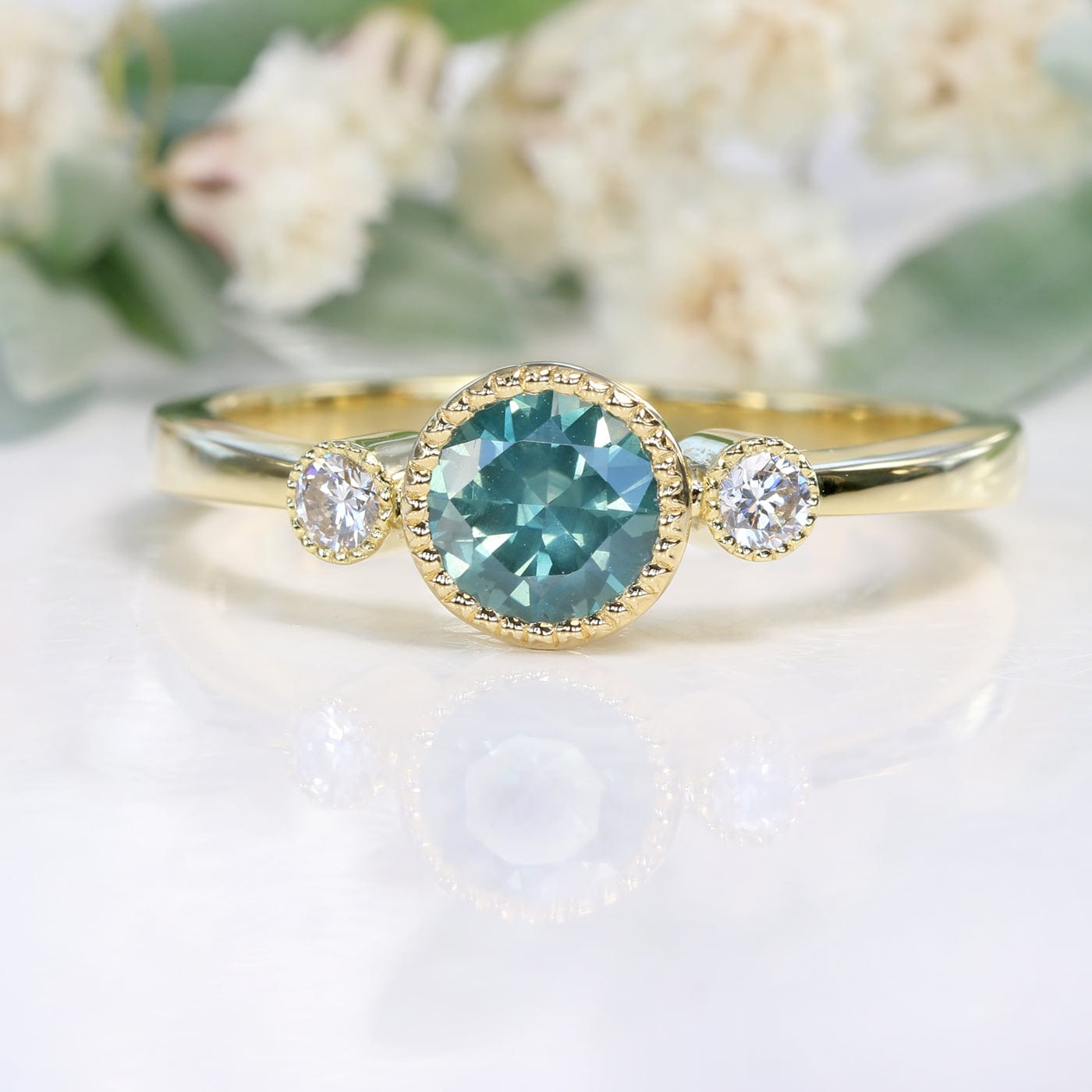 Gold Silky Teal Sapphire and Diamond Trilogy Engagement Ring