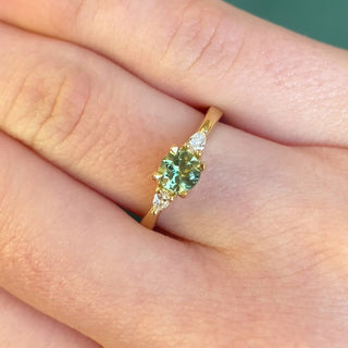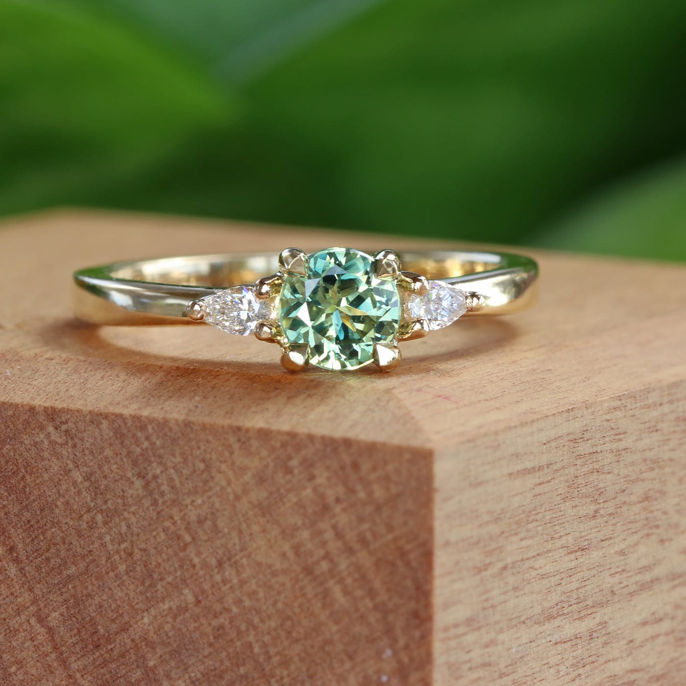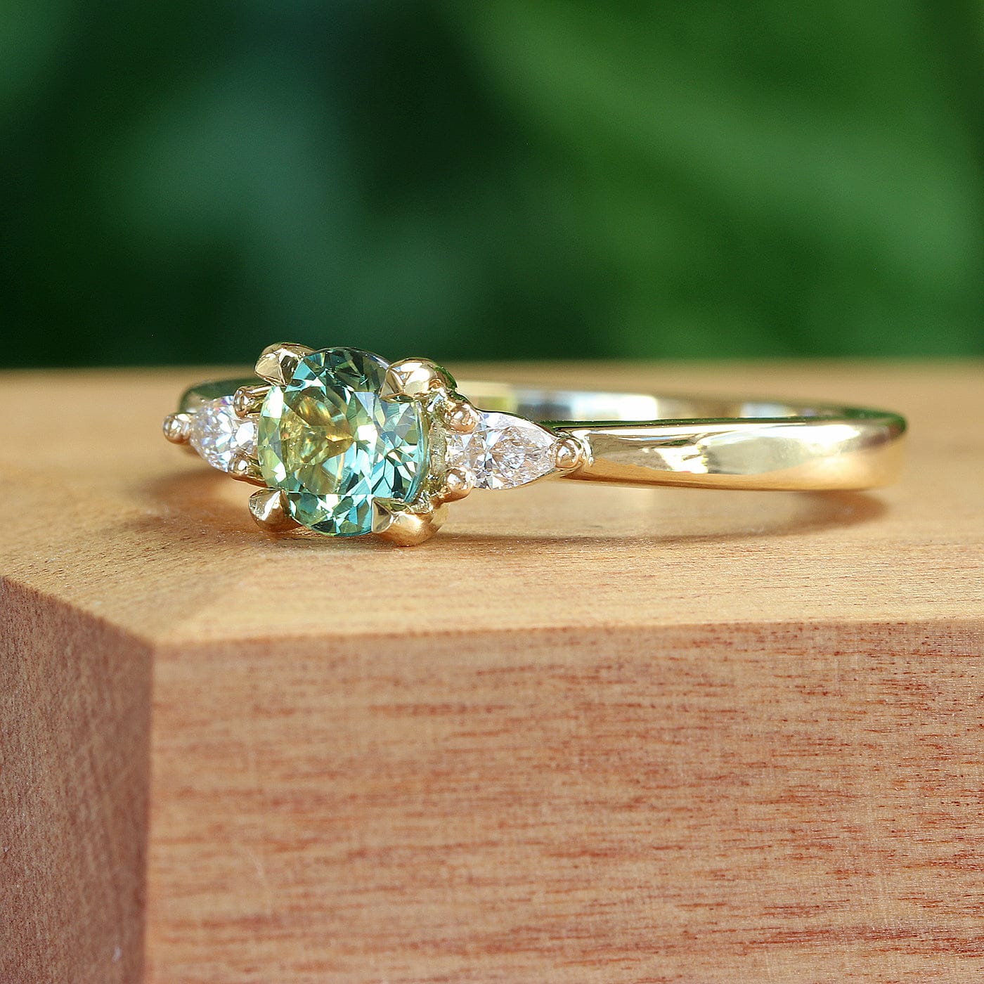 Custom Fair Trade Green Teal Sapphire & Pear Cut Diamond Trilogy Engagement Ring