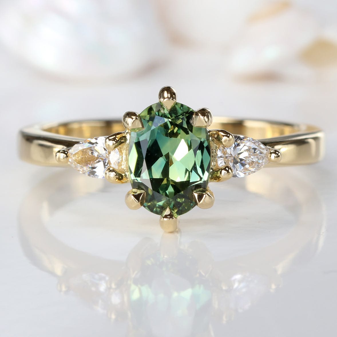 Veryan 18ct gold trilogy engagement ring features a most beautiful oval fair trade Parti sapphire, which is mostly green with a blue band in the centre of the stone. The 0.90ct sapphire is unheated and was fair trade mined in Central Queensland, Australia. It is held in a secure six claw setting. Hugging the centre stone are two natural pear cut diamonds measuring 4mm x 2.5mm each, which are conflict free (G colour and SI1 clarity, weighing 0.20 carats). The ring has been entirely handmade from scratch by the designer from sustainable solid 18ct gold.