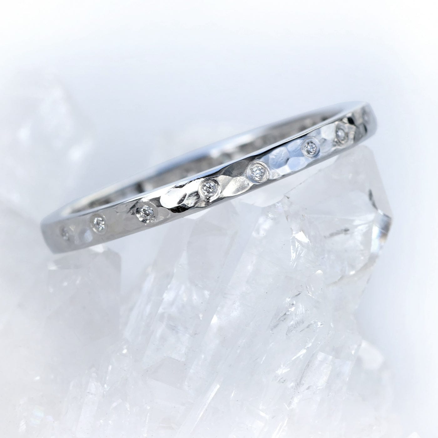 This contemporary slim wedding ring is made from ethically sourced solid 18ct palladium white gold. The 2mm wide band is set with a scattering of twenty 0.8mm fair trade Canadian diamonds all the way around the band. The ring is then finished with a hammered texture and highly polished finish, which reflects the light beautifully.