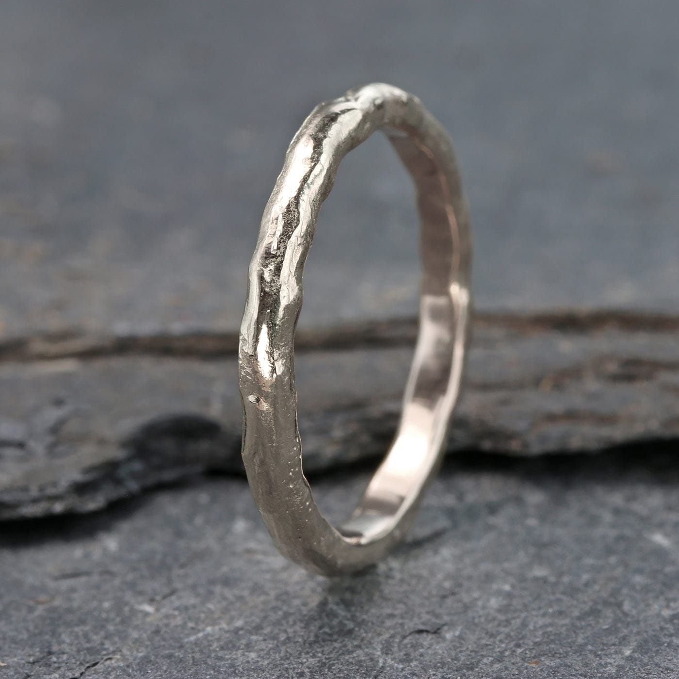 Introducing Mineral, our newest line of bespoke freeform wedding bands. The design channels the essence of volcanic stone, giving the impression it was naturally crafted by nature itself. This elegant 2mm design stands out as the perfect choice for brides seeking a touch of the unique.
