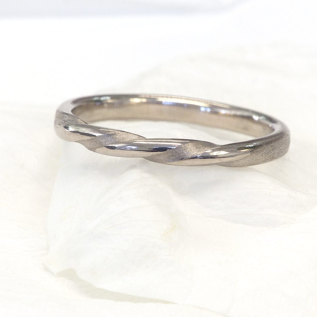 An unusual triple twist wedding band, handmade using ethical solid 18ct white gold. The slim 2mm x 1.5mm band is flat in profile with rounded edges, for additional comfort. The sides of the band have a spun silk texture applied, with the twists and tops highly polished for contrast.
