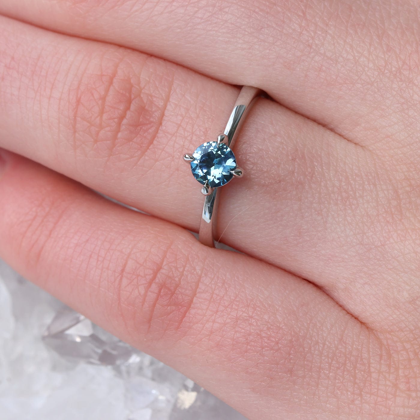 A beautiful custom made 0.6 carat fair trade blue sapphire is held in a hand-fabricated basket setting, which is set into the solid 950 platinum band. The 5mm stone, which has a hint of teal was mined in Montana, USA.