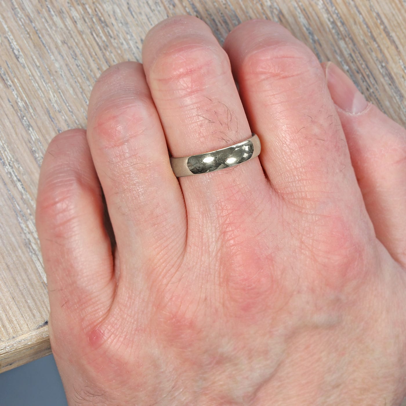 The oval profile of this men’s solid 18ct white gold wedding ring make it very comfortable to wear. The ring measures 5mm wide x 2mm thick and has a highly polished finish.