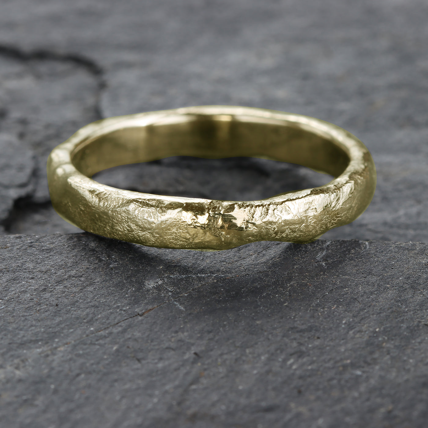 Introducing Mineral - our unique range of free-form wedding rings. With an organic aesthetic reminiscent of molten volcanic formations, this 3mm band, fashioned from pure 18ct gold, is the perfect symbol for brides or grooms desiring a touch distinct from the norm.
