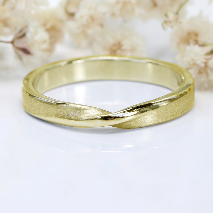 The 3mm band, crafted from sustainable 18ct gold, is versatile for weddings, daily wear, or as a men's engagement ring. Created with precision from recycled gold, each twist signifies an eternal bond.