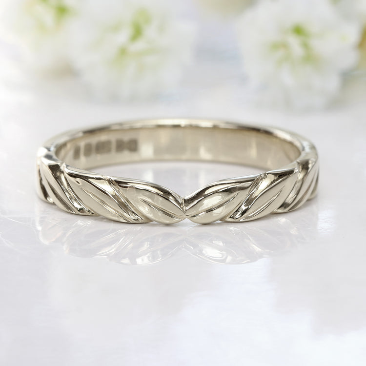 Handmade in our Cornish studio using only ethical recycled 18ct palladium white gold, this unique 3mm wide x 1.5mm deep wedding ring is made with pretty hand-carved leaves on the band. The palladium in the gold means it never has to be plated with rhodium.