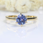 This handmade 18ct gold solitaire engagement ring features a natural unheated Ceylon sapphire in a distinctive periwinkle-lavender tone. Weighing 1.25 carats and measuring 6.3 mm, the sapphire shows a gentle mix of blue and soft purple that shifts beautifully in the light, giving the gem its unique colour.