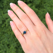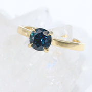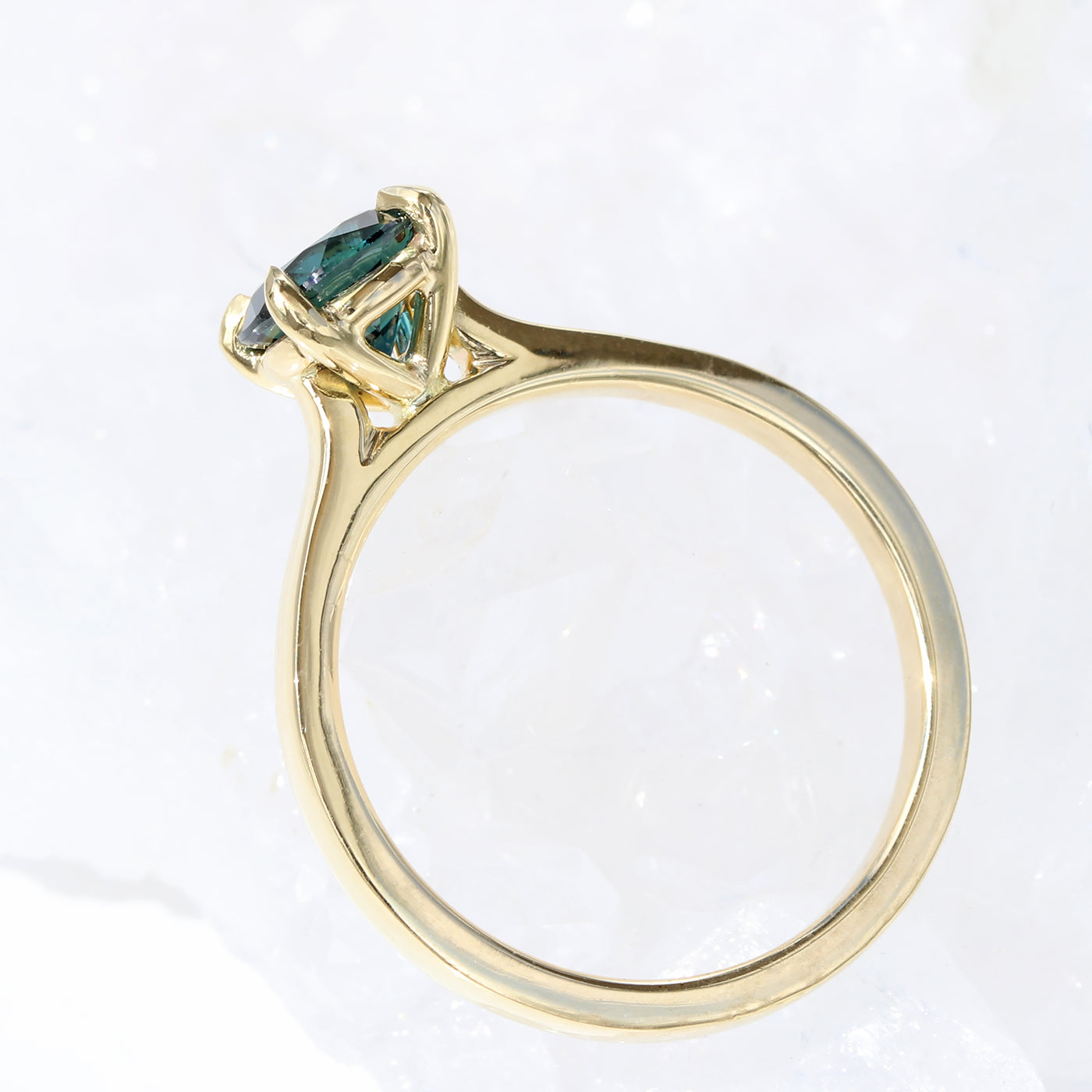 This unusual 18ct gold solitaire engagement ring is set with a deepest teal colour Australian fair trade Parti sapphire. The 1 carat (6mm) unheated stone comes alive when you wear it outside.