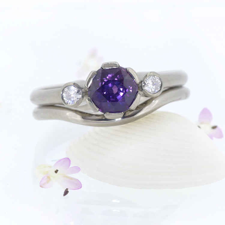 A custom Lilia Nash sapphire and diamond engagement ring, set with a 6mm purple sapphire and 2.5mm side diamonds.