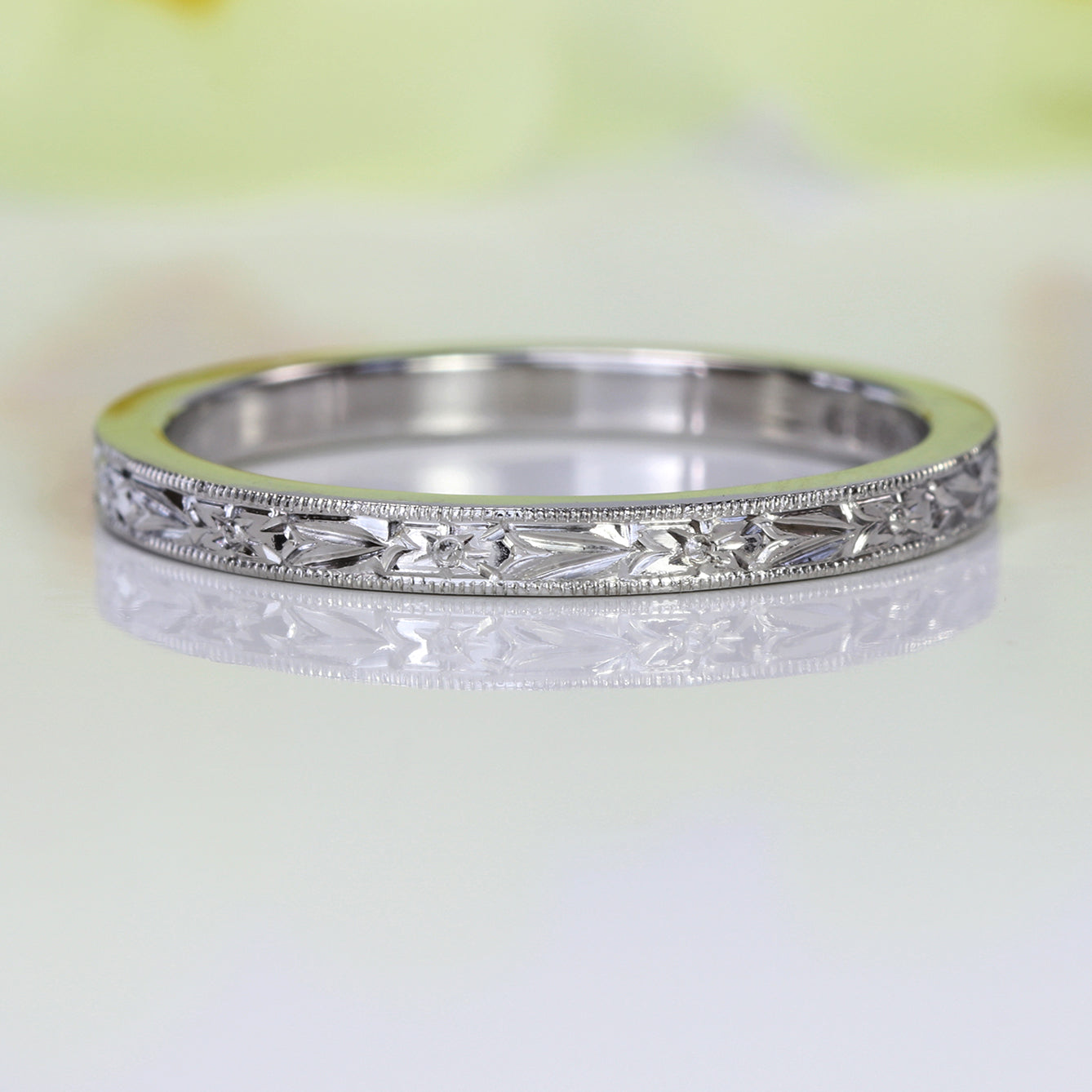 A beautiful hand-engraved orange blossom pattern adorns this solid 950 platinum wedding ring in a slim 2mm x 1.5mm flat profile. Pretty flowers and leaves are engraved around the band, framed in a milgrain border.