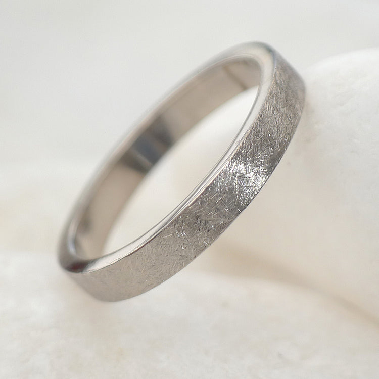 A slim platinum men's wedding ring with a 3mm wide band, 1.5mm depth and flat profile. Expertly handmade in any UK ring size using solid recycled platinum, detailed with Lilia's custom Urban finish.