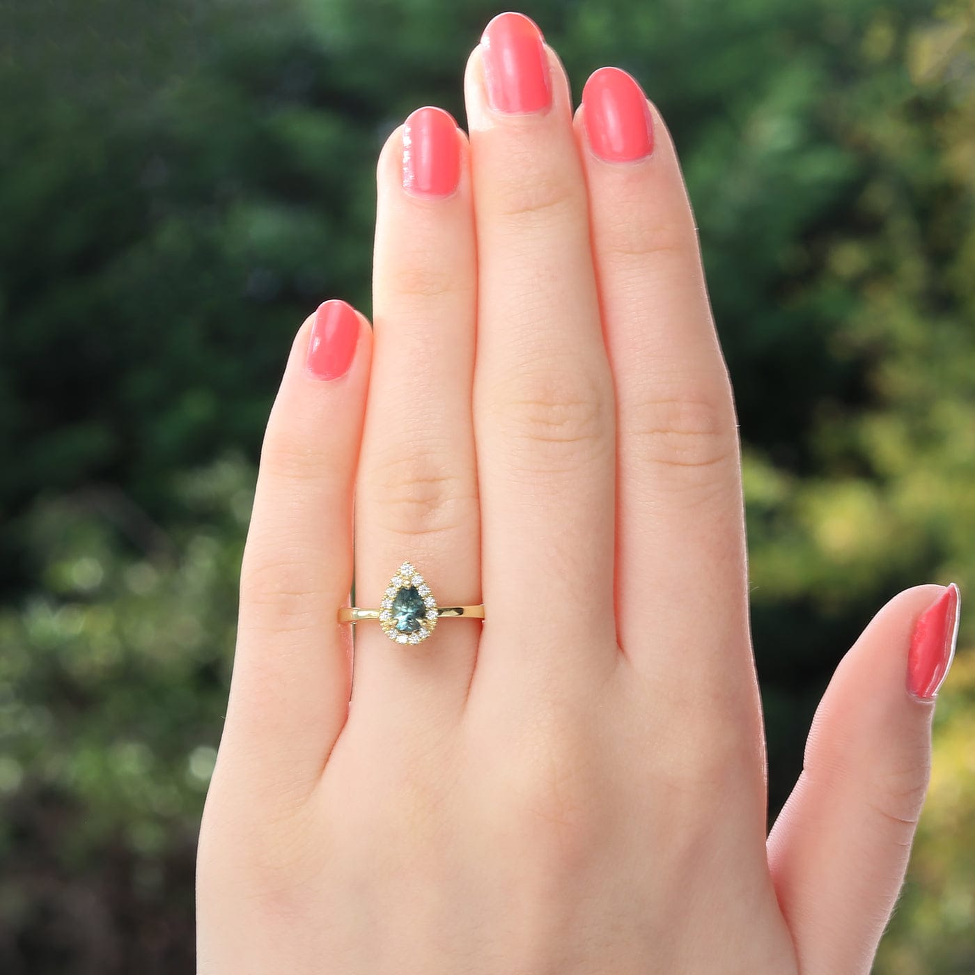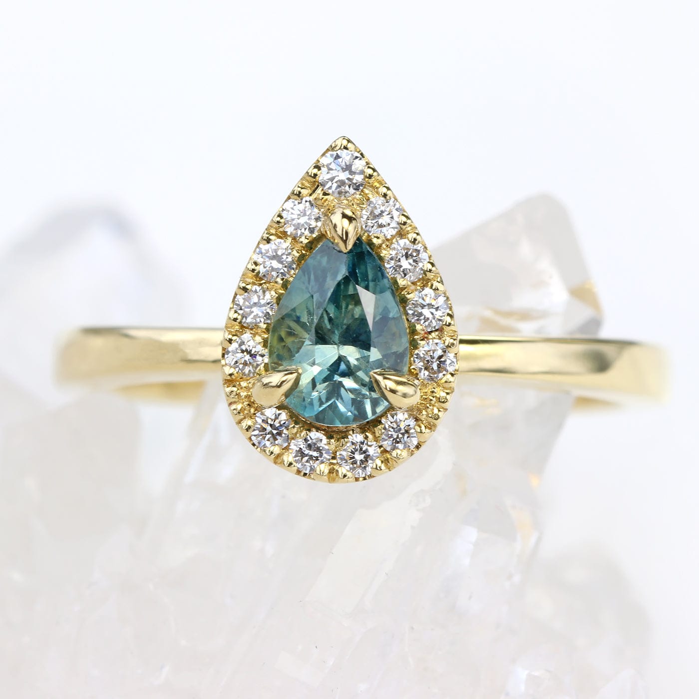 A beautiful pear cut teal Montana sapphire is the star of this ethical 18ct gold ring. The 0.7 carat sapphire is surrounded by a halo of 1.3mm Canadian diamonds and a larger 1.5mm diamond at the top!