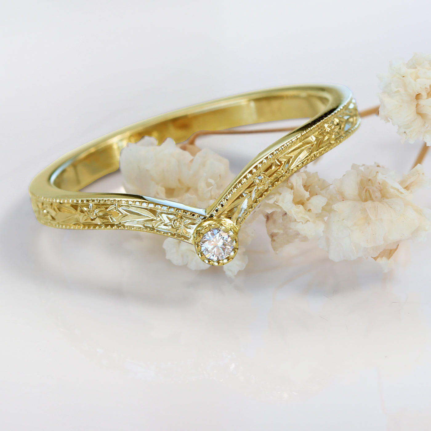 A beautiful 18ct gold diamond solitaire wishbone wedding or eternity ring, with a floral orange blossom hand engraving around the band.