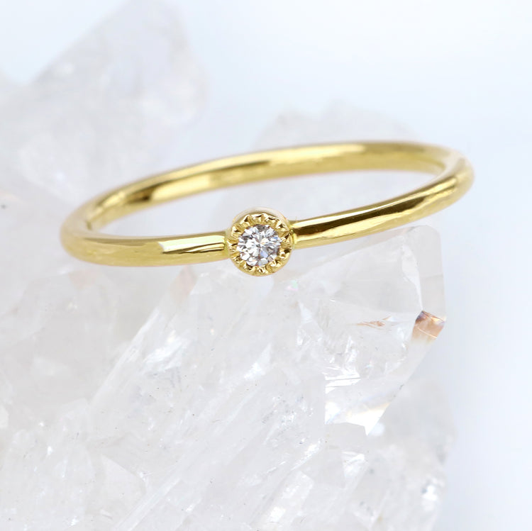A minimalist diamond solitaire ring, handmade in 18ct gold and set with a 2mm fair trade diamond.