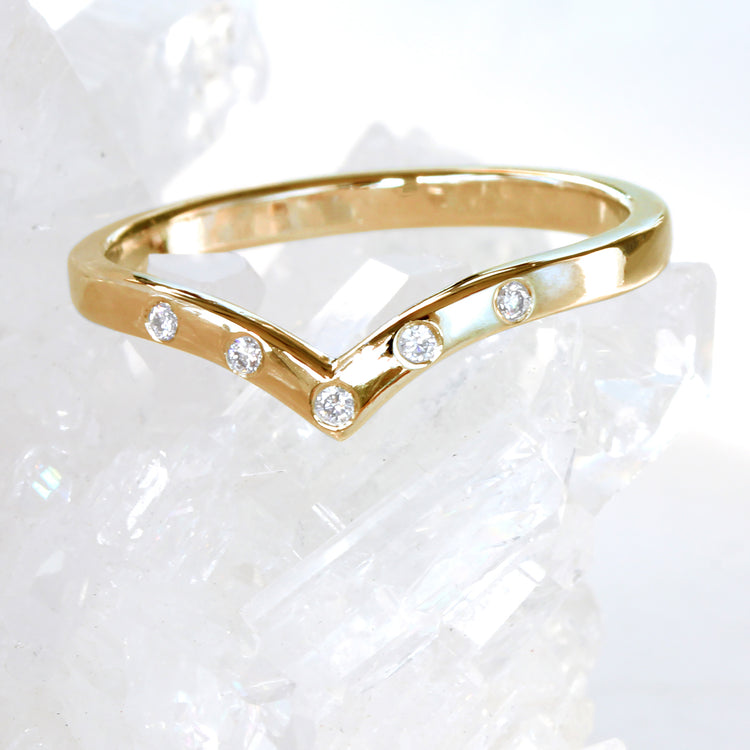 An understated eternity ring, handmade in 18ct rose gold and set with 5 fair trade white diamonds. This contemporary alternative to traditional full eternity rings is crafted into 2mm wishbone band with 5 perfectly spaced diamonds flush set into the front of the band.