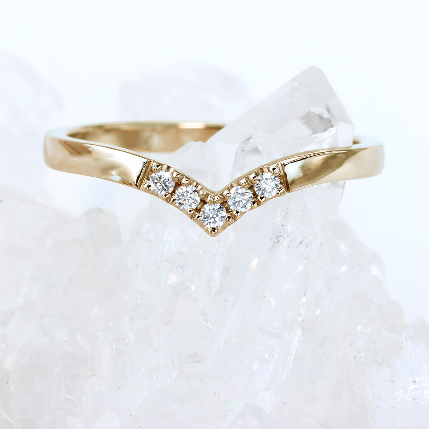 A pretty 18ct rose gold wishbone ring, pavé set with five Canadian fair trade diamonds. This ring is suitable for wear as either a wedding ring or eternity ring, or wear several together to create a unique ring stack.