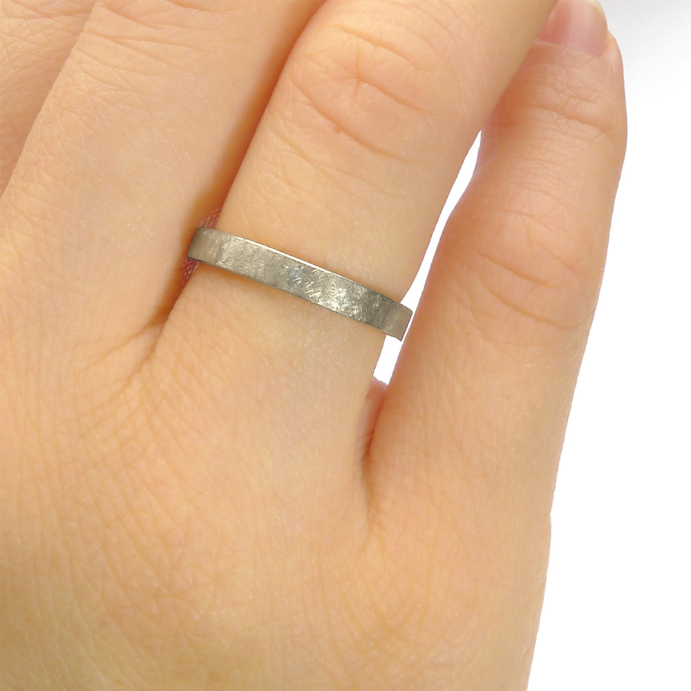 Lilia Nash's urban finish flat wedding ring with a 3mm width, handmade in solid 18ct palladium white gold.