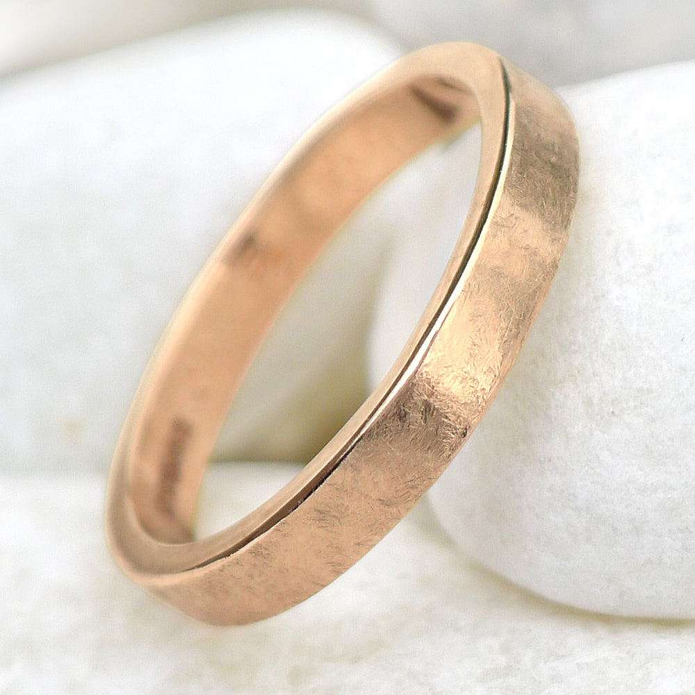 A slim rose gold wedding ring with a 3mm width and flat profile. Handmade in England using 18ct rose gold from recycled sources.