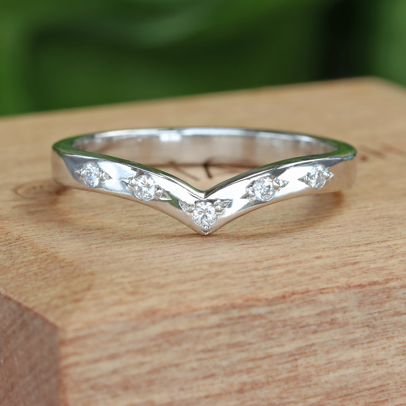 A stylish wishbone eternity or wedding ring, handmade from ethically sourced solid 950 platinum. The ring features five 1.5mm fair trade Canadian diamonds with pretty bead set detail holding the stones. The 2.5mm band is slightly wider than our other wishbone rings, giving the ring more presence on the finger.