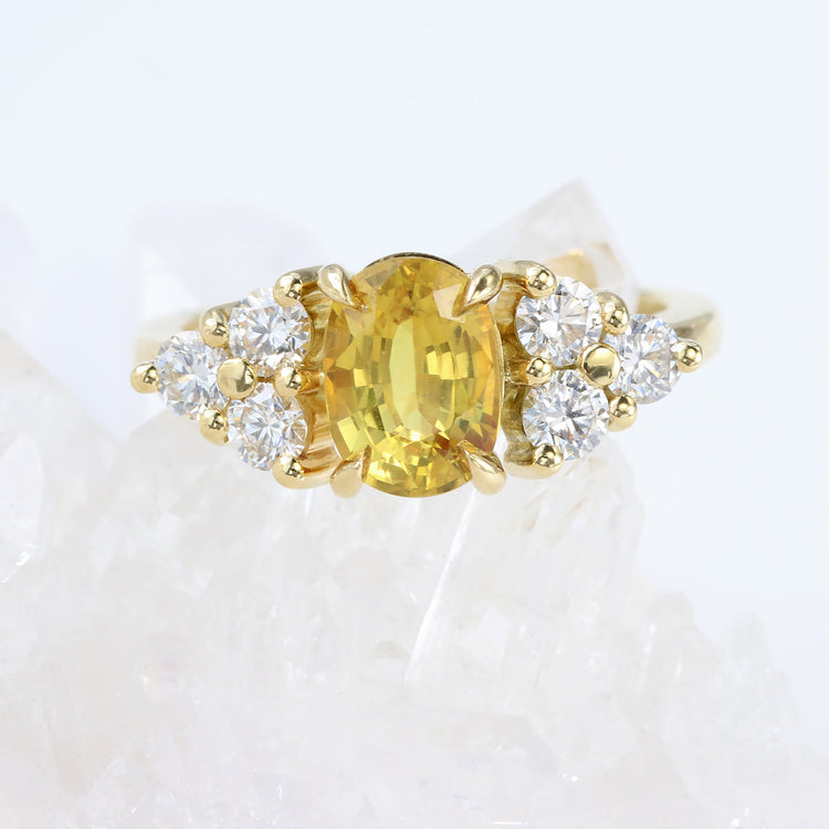 A bespoke 18ct yellow gold ring, prong set with an oval cut yellow sapphire (1.84 carat, 8mm x 5.9mm) and six larger 3mm Canadian side diamonds (G-H colour, VS1 clarity) to form a cluster.