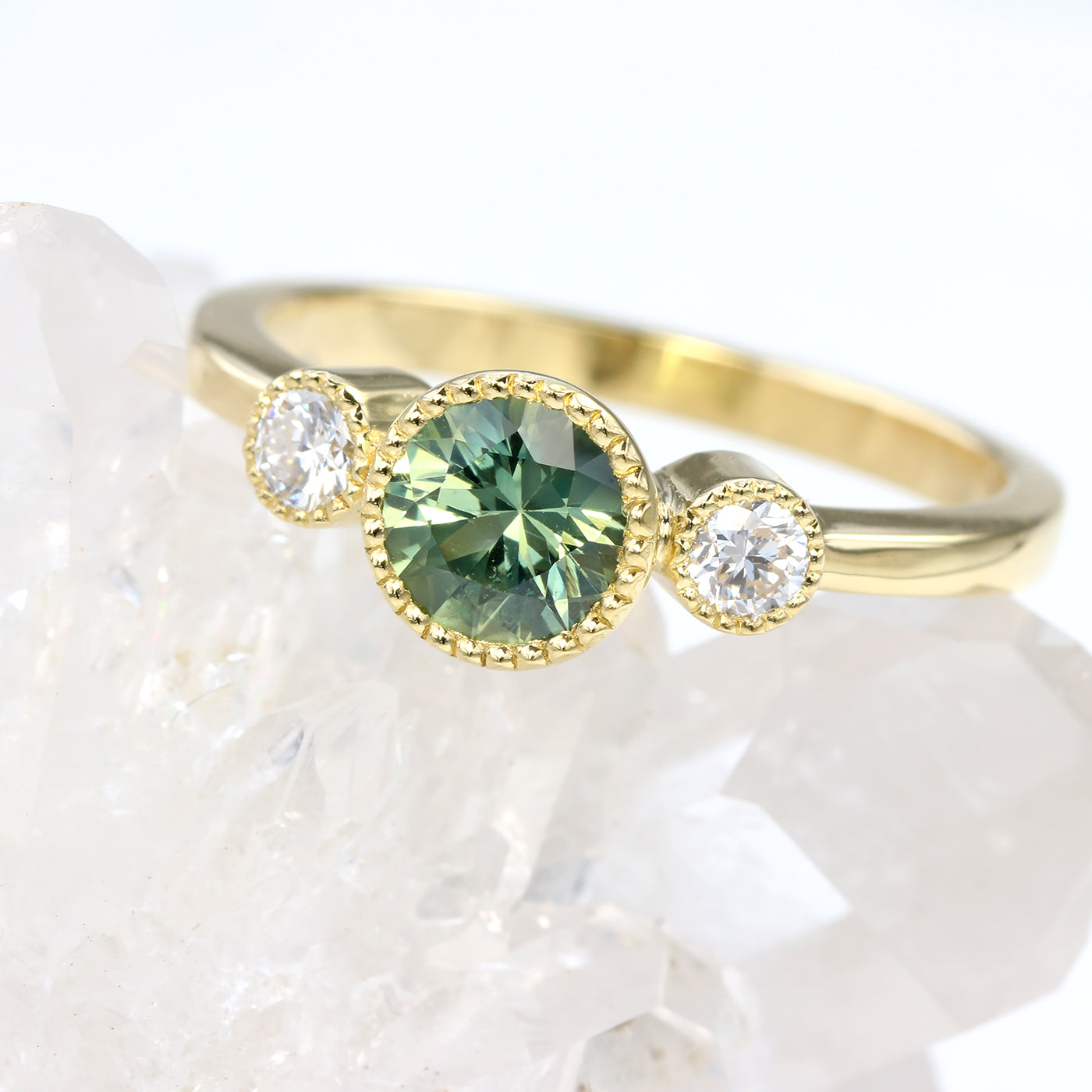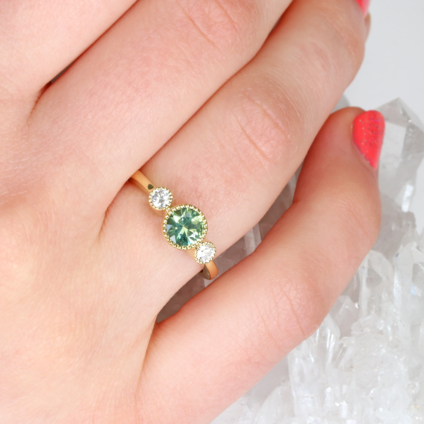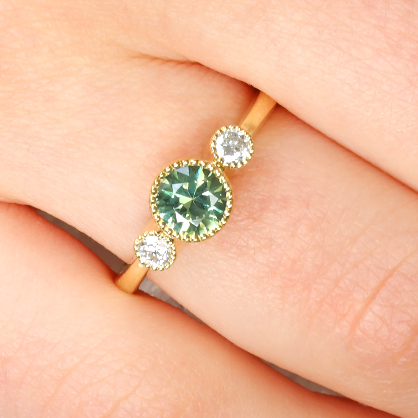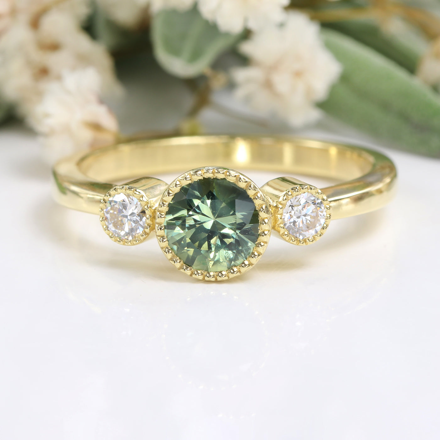 Indulge in the allure of this exceptional trilogy engagement ring, where the centerpiece, a 0.8 carat natural unheated green sapphire, gleams with captivating teal sparkles.
