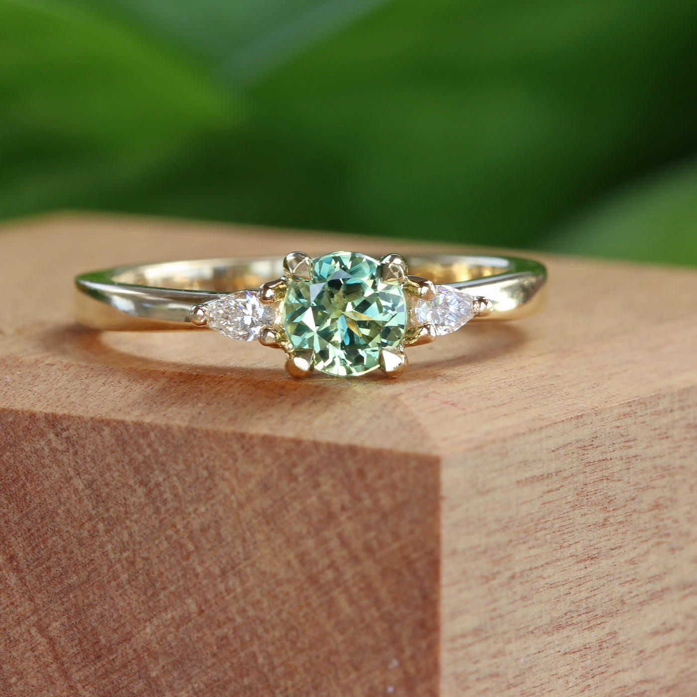Custom Fair Trade Green Teal Sapphire & Pear Cut Diamond Trilogy Engagement Ring