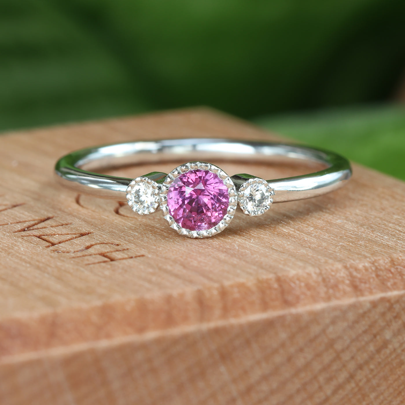 This handmade platinum pink sapphire and diamond trilogy engagement ring features a vivid natural pink sapphire at the centre of a petite three-gem design. The sapphire weighs 0.32 carats, measures 4.2 mm and is completely natural and unheated — a rarity that means its vibrant hot-pink colour is exactly as it was formed in the earth.
