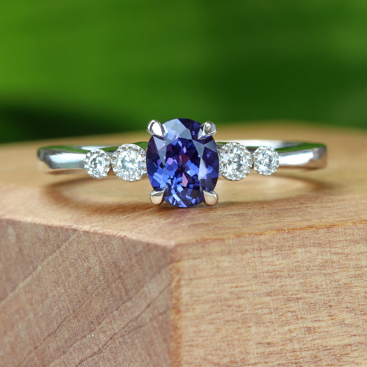 A custom made ring wet with a dazzling purple-blue Ceylon sapphire, with pink flashes. The oval cut sapphire measures 5.9mm x 4.9mm and weighs 0.7 carat and is hugged by four fair trade Canadian diamonds in pretty milgrain-edged settings. This ring was handmade by Lilia in our Cornish studio from 100% recycled solid 950 platinum.