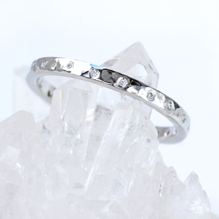 The perfect anniversary gift to commemorate a special relationship milestone, the Lilia Nash Slim Hammered Diamond Palladium White Gold Eternity Ring features a scattering of twenty 0.8mm white diamonds set in a slim 2mm ring band.