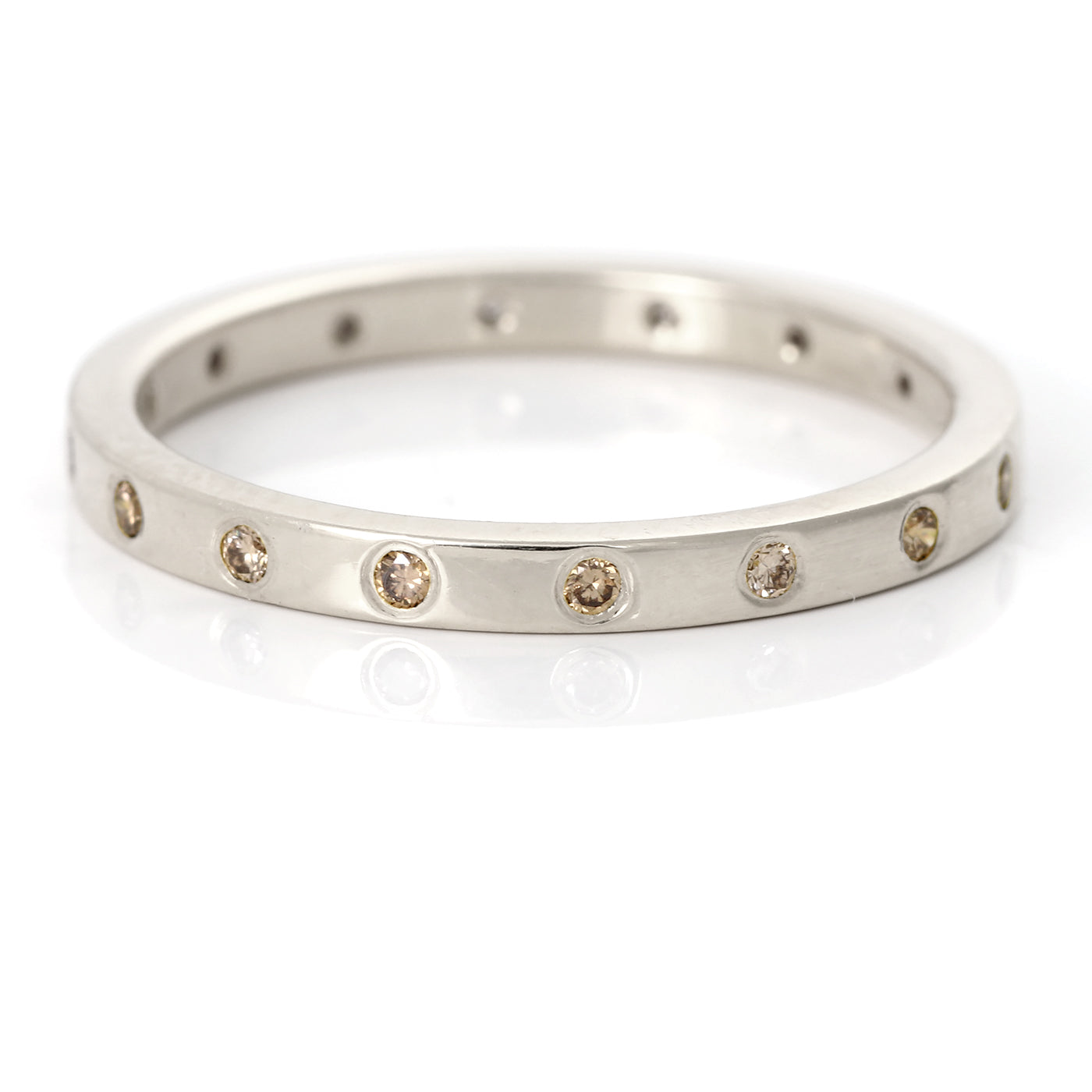 A unique wedding ring by Lilia Nash, handmade using solid 18ct palladium white gold and set with sixteen 1.3mm fair trade champagne diamonds.